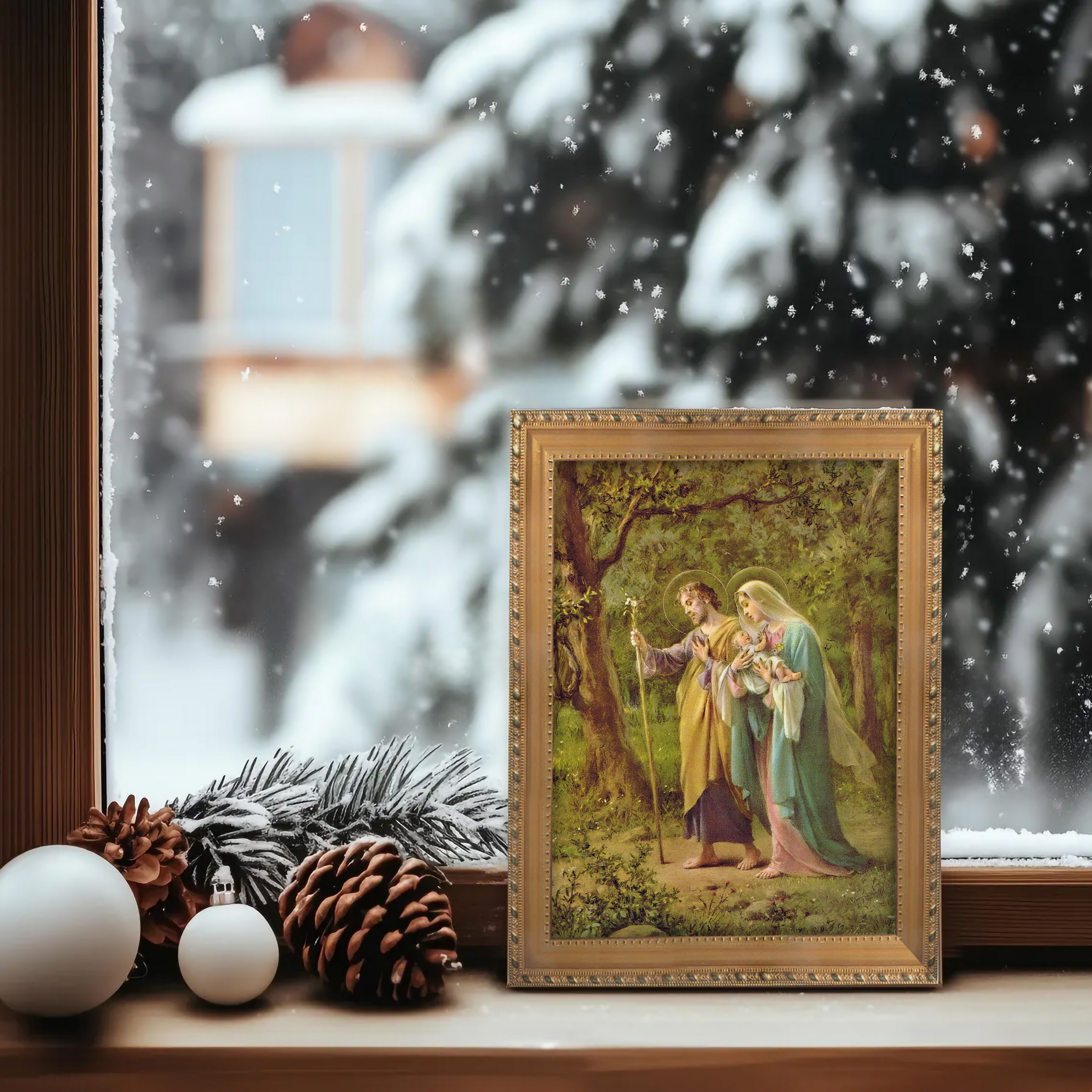 Keluarga Suci terdiri daripada Yesus, Perawan Maria, dan Santo Yusuf, yang mewakili model kasih sayang, iman, dan perpaduan yang sempurna dalam kehidupan Kristian. Maria, yang dipilih untuk menjadi Ibu Tuhan, memelihara Yesus dengan penjagaan yang lembut dan pengabdian yang teguh. Yusuf, pelindung yang rendah hati dan soleh, membimbing dan menjaga keluarga dengan kekuatan senyap. Yesus, walaupun semasa kecil, memancarkan kedamaian dan tujuan ilahi. Ikatan mereka adalah simbol keharmonian ilahi dan asas suci semua keluarga Kristian.