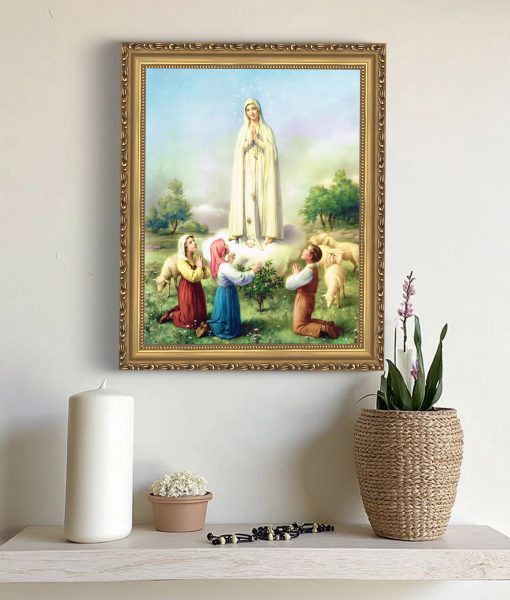 Bunda Maria dari Fátima ialah gelaran yang diberikan kepada Perawan Maria ketika baginda menampakkan diri di hadapan tiga orang anak gembala berhampiran kampung Fátima. Karya seni ini menggambarkan Bunda Maria dari Fatima, memegang rosario dalam doa. Gambar pengabdian dan kedamaian yang abadi, sesuai untuk ruang doa anda, altar rumah, atau sebagai hadiah yang bermakna.