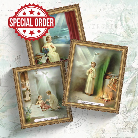 These quality Italian Lithographs of ‘The Seven Gifts of The Holy Spirit’ are illustrated in 7 bright colors, and come in a set of 7 prints. These make perfect gifts or instructional tools for any classroom, church, prayer group, or home. Prints included: The gift of understanding, The gift of counsel, The gift of wisdom, The gift of knowledge, The gift of piety, The gift of the fear of the Lord, and The gift of fortitude.